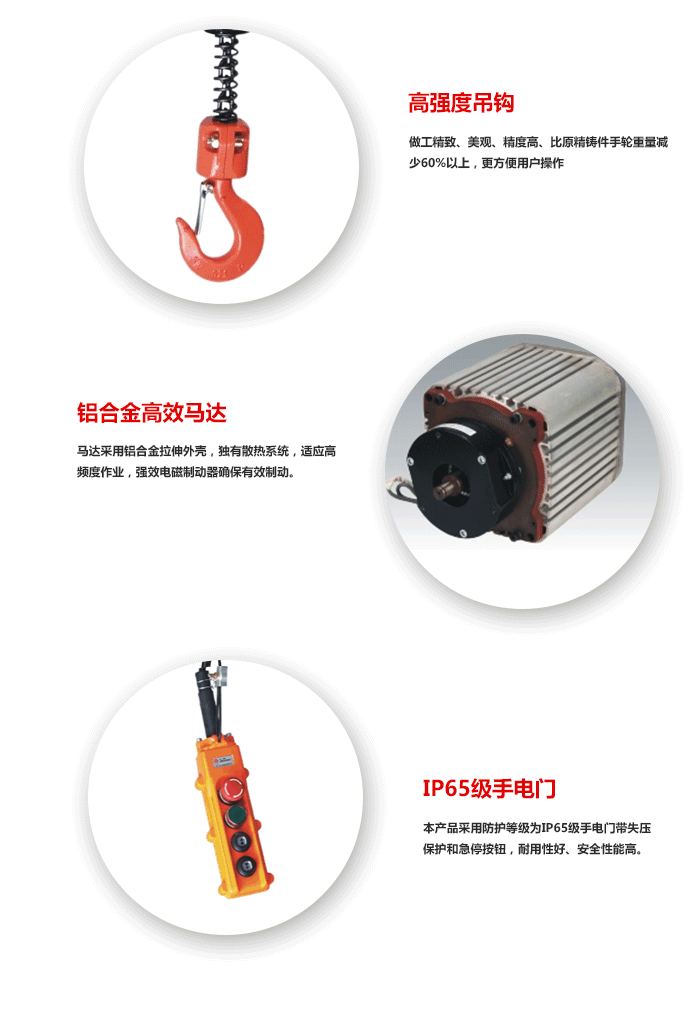 5、极限开关:吊上吊下都有极限快关装置,使电机自动停止,反防止链条超出,确保安全。